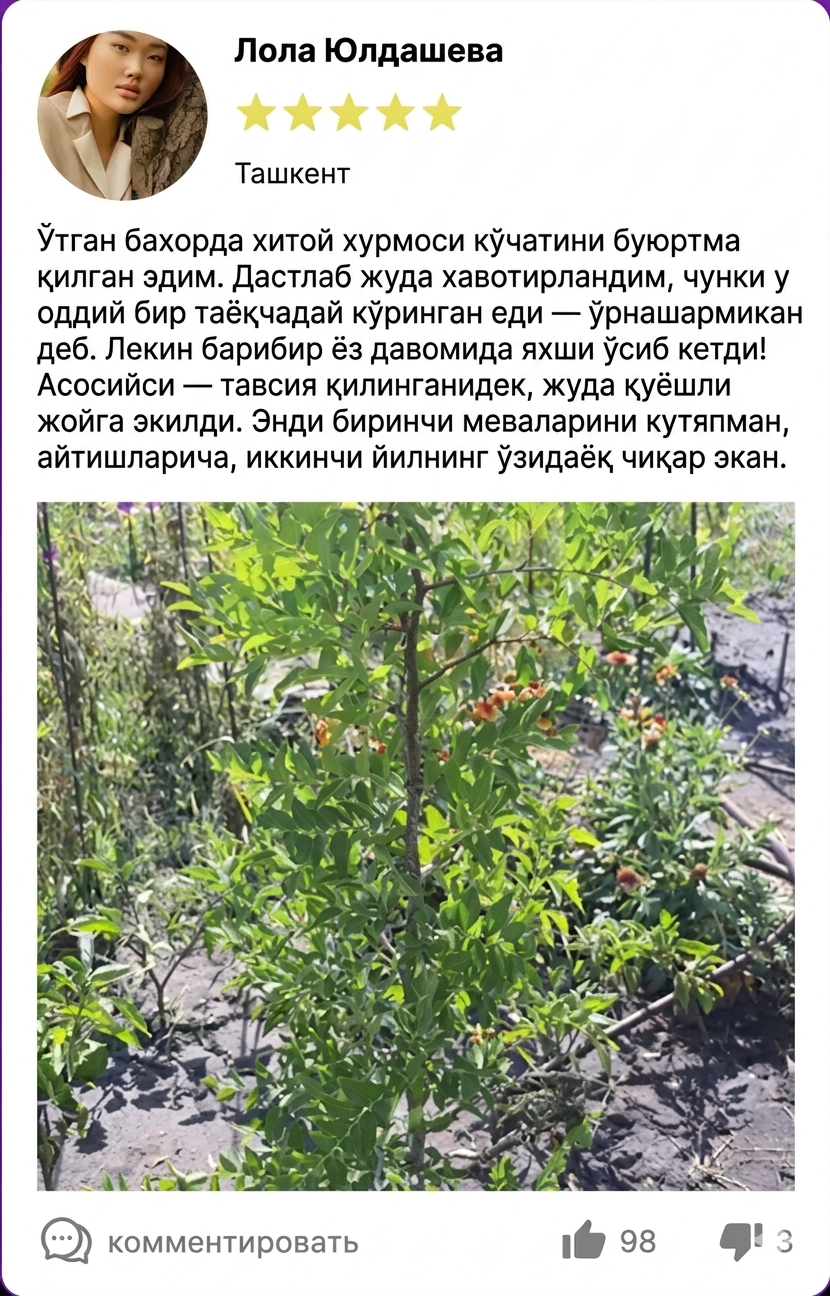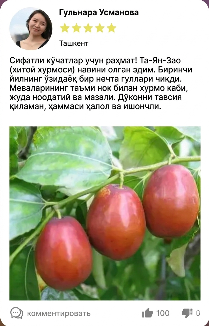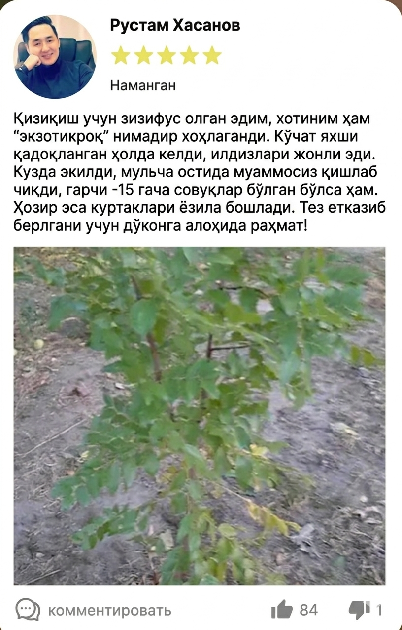 Ўз боғингизда зизифус кўчатларини етиштиринг — ва шу мавсумнинг ўзида ўзингиз етиштирган ширин меваларни йиғиб олинг. Бу парвариши осон ўсимлик иссиқликка, қурғоқчиликка ва қишга яхши бардош бера олади, тез мослашади ва ҳар йили барқарор ҳосил беради.