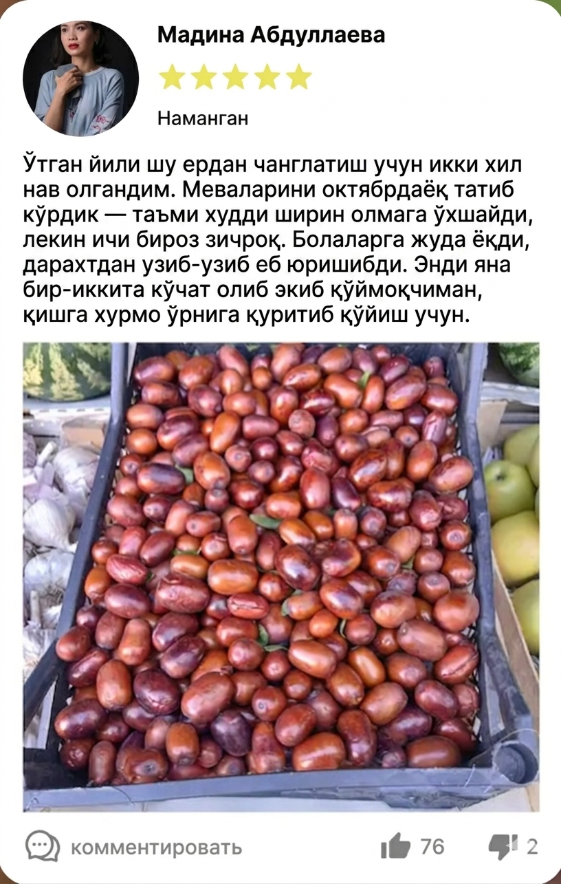 У нафақат таъми, балки фойдаси билан ҳам қадрланади: зизифус С витамини ва фойдали микроэлементларга бой, иммунитетни қўллаб-қувватлайди ва энергия беради. Бир марта дарахт эксангиз, йиллар давомида мураккаб парваришсиз мазали ва фойдали ҳосил оласиз.